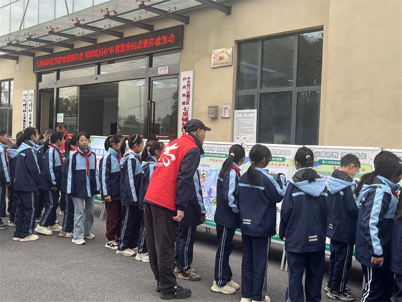 在活动现场,白庙小学师生及社区居民参观完反邪教主题展板后,在社区讲解员的带领下,走进由市科技馆协助打造的七里铺社区微型科普馆。展馆设置电与磁、汽车历史等七大主题展区,孩子们兴致勃勃地围着互动装置操作,频频向讲解员追问科学原理,居民们也驻足参与,现场形成浓厚的科普氛围。